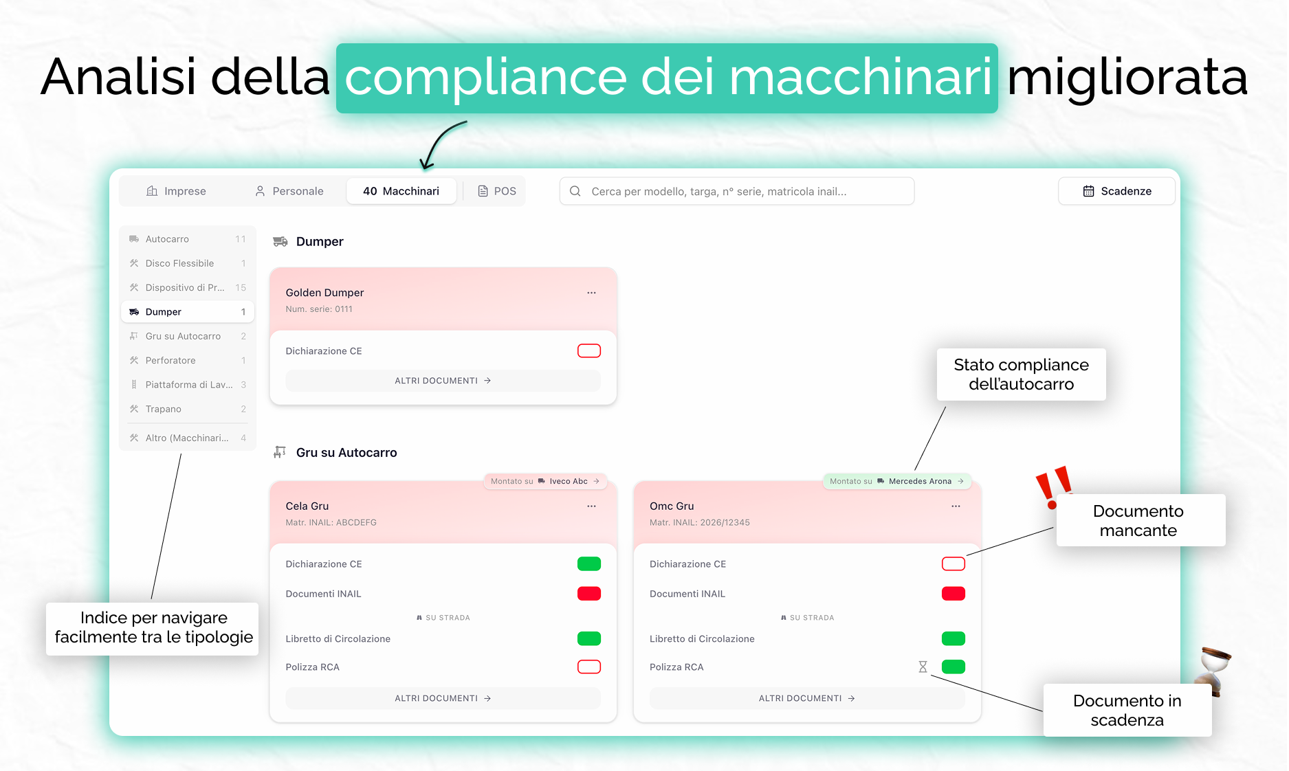 Gestire tutto questo con fogli Excel significa ricordare quale tipologia è ogni macchinario, sapere quali documenti servono, verificare che siano tutti presenti e validi, e monitorare le scadenze che hanno cadenze diverse.